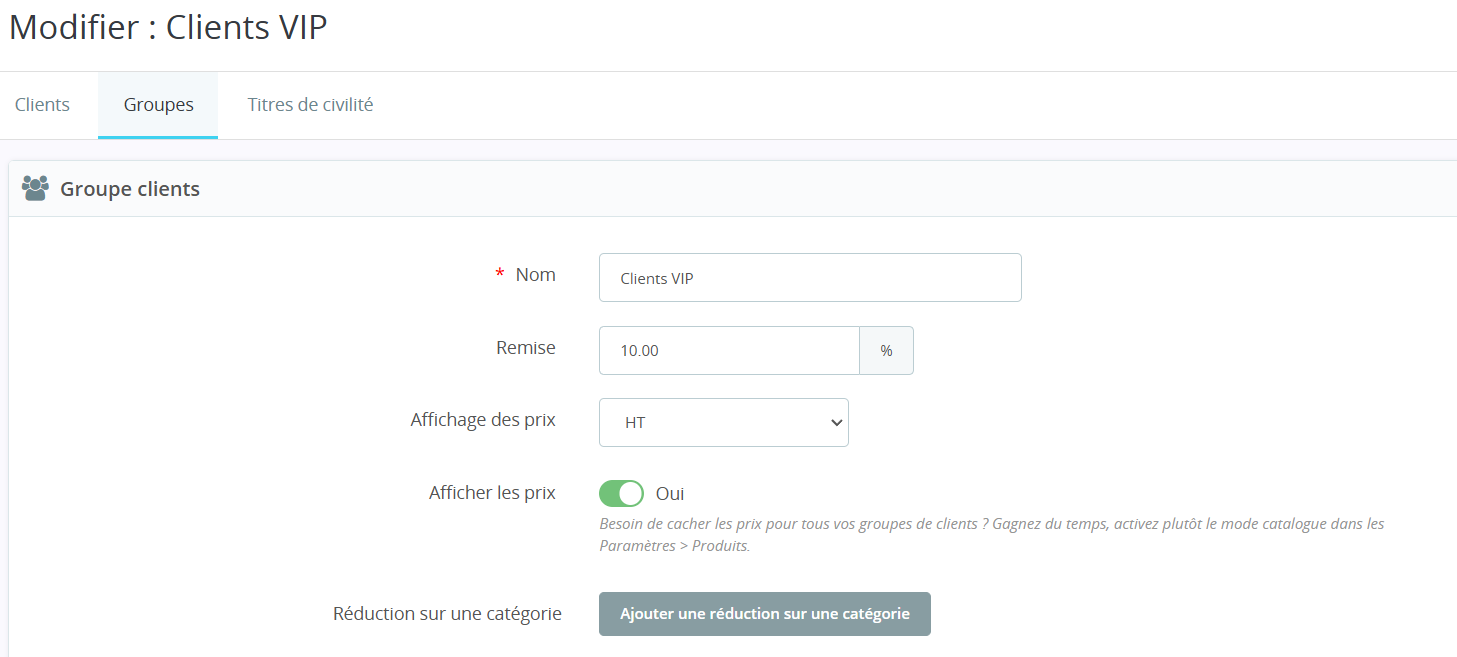 Les groupes clients permettent de classer vos clients dans votre backoffice. Lors de la création d'un compte client, vous pouvez, modifier son groupe sur sa fiche produit (voir article Modifier les informations client). Les groupes clients permettent :